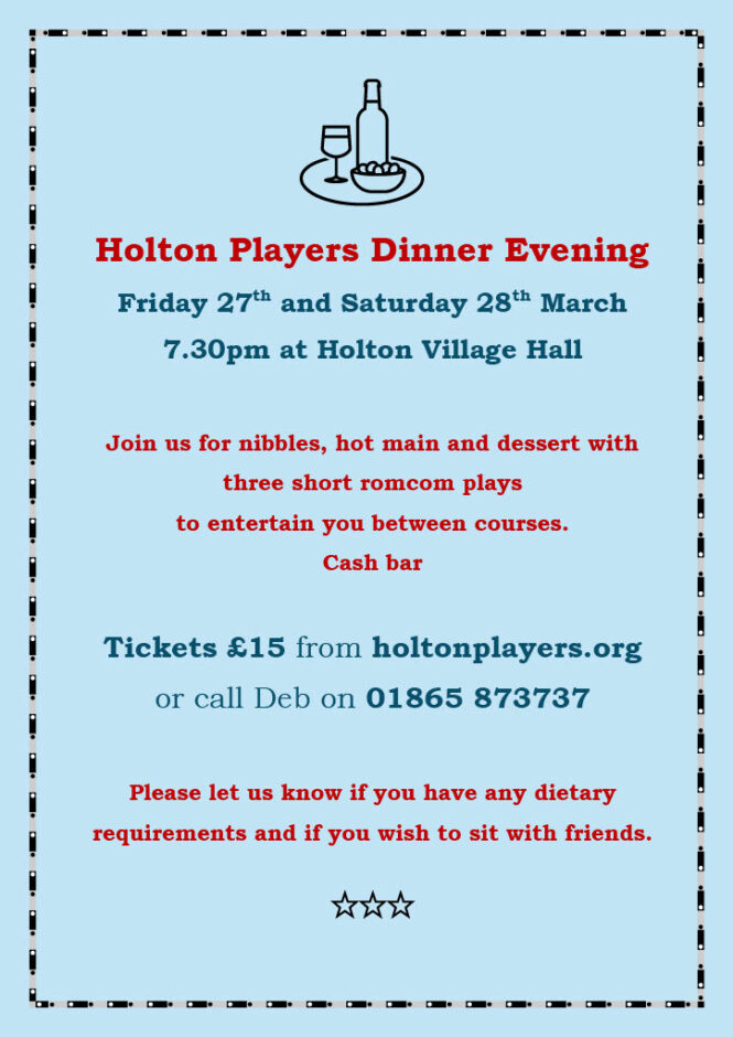 The Holton Players were founded in 1991 and have presented numerous plays since then, normally one in the Spring and one in the Autumn each year. The body of work presented includes plays written both by local authors alongside those of the major playwrights. Recent productions have included works by Ayckbourn, Rattigan,Maugham and Wilde.